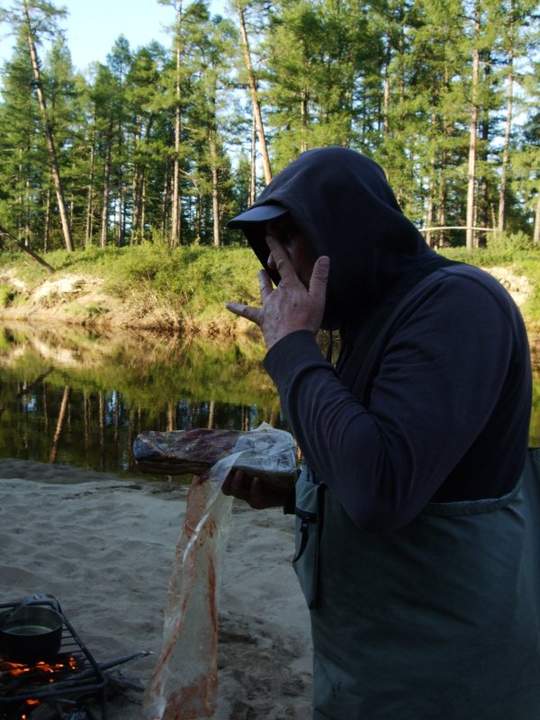Потихоньку наш лагерь приходит в движение. Готовим завтрак, сворачиваем палатки, грузим весь скарб на плавсредства. В путь. Снова волочил, перемежающийся со сплавом. Равномерно река становится обширнее и поглубже. Идём на вёслах. Так как вода проложила себе путь по заболоченной котловине, река значительно петляет. Течение слабенькое. Чтоб не выбиться из графика движения, пришлось значительно помахать веслами. Кое-где к обеду в первый раз повстречали подводных жителей этого водоёма. Это была щука. Рыба избрала местом собственной засады мелководный плес и была увидена издалека. Останавливаемся. Свист воздуха, рассекаемого спиннингом, шуршание по кольцам лески. 5 пар глаз провожают взором блесну, отправившуюся в полет к священной цели. Перелёт левее. Дружный выдох, мимо. Не успели моргнуть глазом, как щука моментально разворачивается и делает рывок в сторону блесны. Атака, промах. Вновь быстрый разворот, и уже догоняя приманку малость по дуге бьёт, сейчас точно. Вся картина охоты как на ладошки. Вода прозрачная, очки поляризационные. Маленькая борьба и рыба в руках. Не большая щука, килограмма на полтора, большинством голосов помилована и отчаливает вспять в родную стихию. Гребём далее. До вечера повстречали ещё несколько представительниц зубастого племени, но на них только любовались, не принимая попыток изловить. Обнаружив применимое место для ночлега, останавливаемся. Сейчас нас приютила не широкая песочная коса. В стандартную схему выгружаем, ставим, собираем, разжигаем, готовим, добавляется новый пункт-купаемся. Приятно после томного денька погрузиться в холодную чистую воду. Сполоснувшись, не сговариваясь, собираемся у дежурного ящичка, в каком хранятся продукты, созданные для обеденного перекуса. Необходимо перекусить, пока ужин не готов. Снова же не возбраняется хлопнуть по рюмашке за прибытие. Ха, все наверное слышали выражение-сало в шоколаде, а может и пробовал кто. Я не пробовал, а вот копченое сало в малиновом джеме испытать довелось. Кто-то в обед неплотно закрыл крышку, и пожалуйста, продукт готов к употреблению. Типичный деликатес, я для вас доложу, пальчики оближешь.